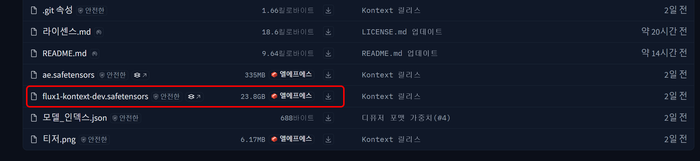flux1-dev-kontext_fp8_scaled 모델 다운로드 링크 입니다.(comfyUI)