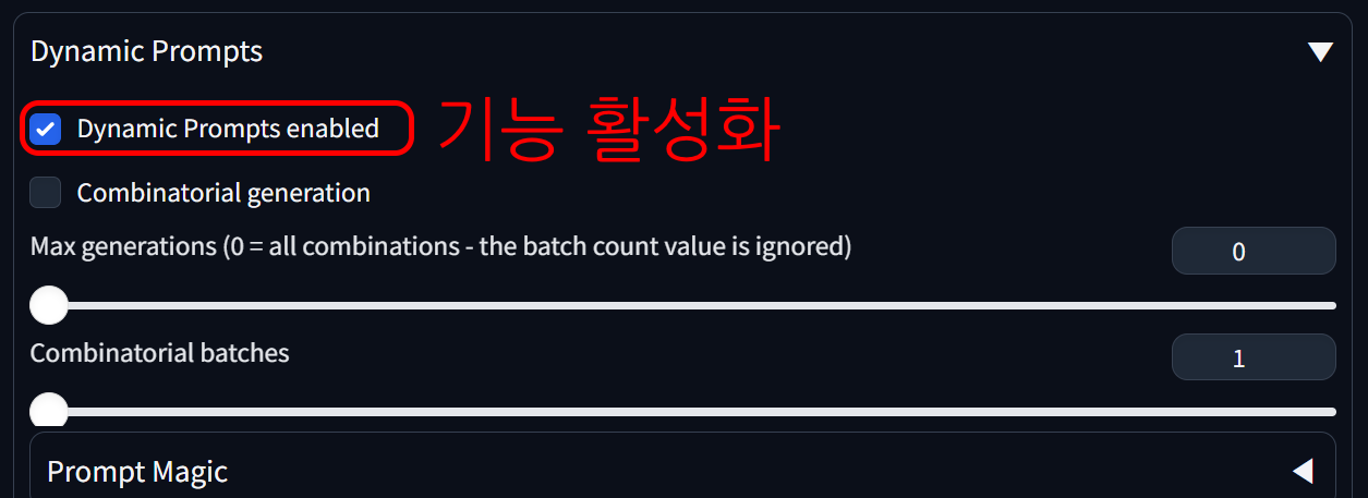 2️⃣ Dynamic Prompts 섹션을 찾아서 펼칩니다.