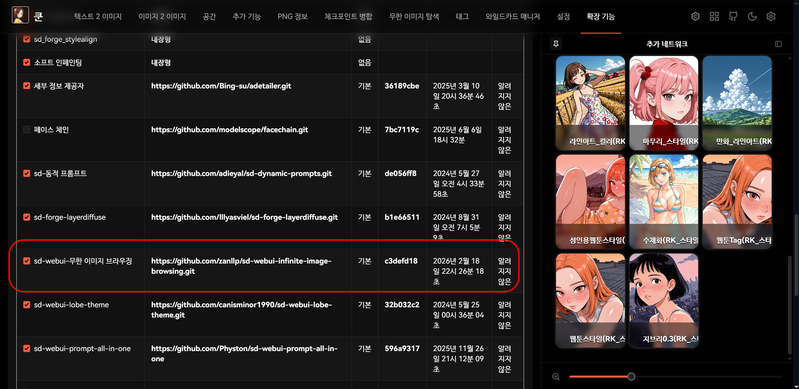 설치를 마치고 Forge를 리부팅하면 상단 탭에 infinite image browsing(무한 이미지 브라우저)라는 탭이 추가된 것을 알 수 있습니다.