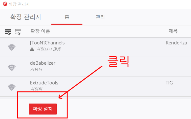 그림과 같이 확장 관리자가 나타납니다. 여기서 하단의 확상설치를 클릭하여 다운받은 rbz 파일을 선택하는 것으로 설치가 완료 됩니다.