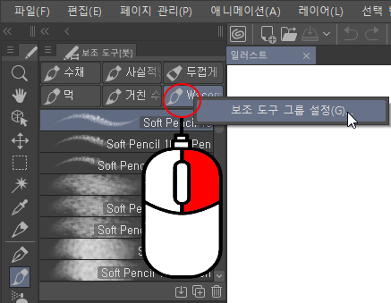 이제 이 보조도구 그룹 메뉴를 통해 포토샵용 브러시 파일을 불러 옵니다.