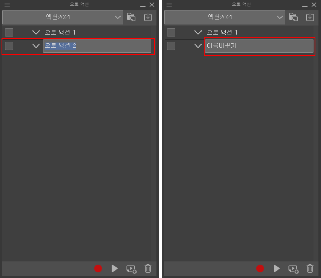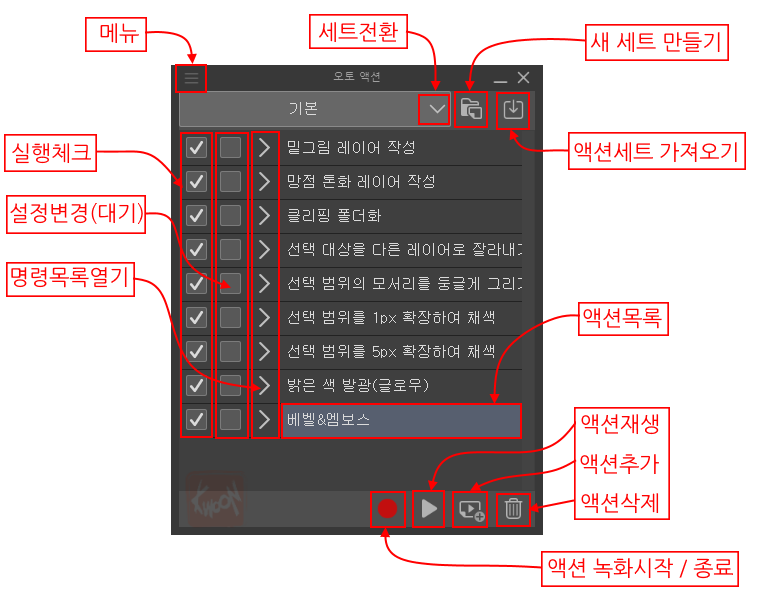 액션 명령 녹화는 위 그림처럼 팔레트 하단에 있는 붉은 원형 버튼을 눌러서 녹화를 시작하면 됩니다. 이 버튼이 눌려지면 동그란 모양의 버튼이 네모난 붉은 버튼으로 바뀌고 이후로 클립스튜디오에서 실행하는 모든 명령이 저장됩니다.
