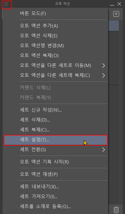 클립스튜디오의 액션 팔레트는 여러 개의 세트를 불러올 수 있고 또한 그 세트들을 관리하는 기능이 있습니다.