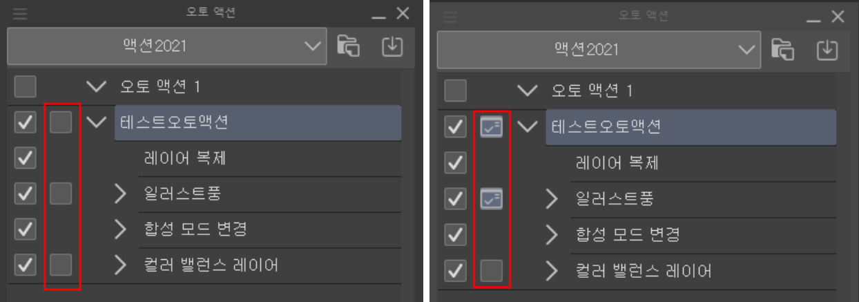 1개의 액션은 여러 개의 명령을 담을 수 있습니다. 명령은 클립스튜디오에서 실행되는 명령을 말합니다.