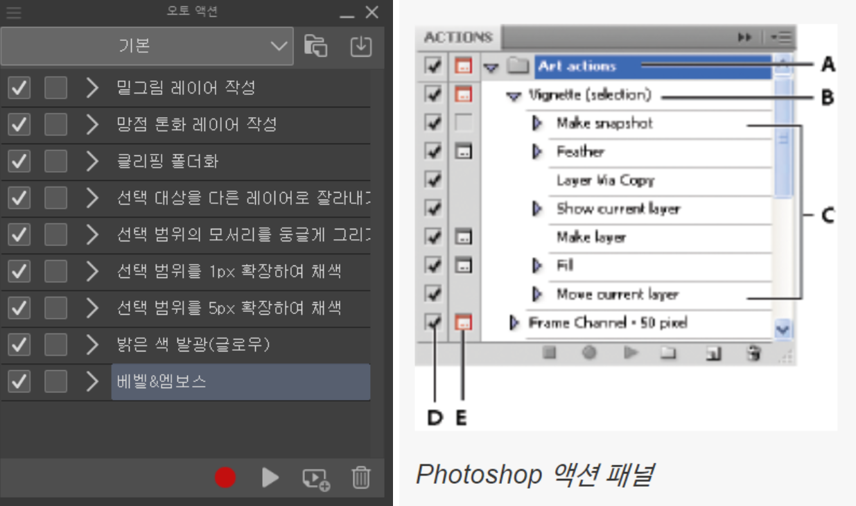 기능면에서 클립스튜디오의 액션과 포토샵의 액션은 큰 차이가 없습니다. 다만 각 프로그램의 고유 기능들의 차이가 있기 때문에 두 App간의 액션은 호환되지 않습니다. 액션 기능의 다양성 면에서는 포토샵의 액션스크립트가 월등하게 기능적이고 효과적입니다.(만약 포토샵 액션과 호환이 된다면 수많은 포토샵용 액션을 이용한 편리한 작업들이 클립스튜디오에서도 쉽게 구현될 수 있을 것입니다.)