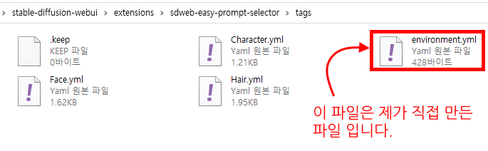 경로는 자신이 설치한 스테이블 디퓨전의 stable-diffusion-webui\extensions\sdweb-easy-prompt-selector\tags 경로 입니다. 이 폴더로 이동해 보면 다음과 같은 파일들이 보일 것입니다.