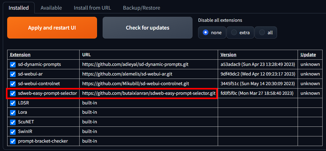 웹UI의 익스텐션을 통해 검색하여 설치 할수도 있고 위 링크를 익스텐션의 설치 URL에 붙여 넣어 설치 할수도 있습니다. 설치법은 다른 확장기능과 같으므로 설명을 생략 합니다.