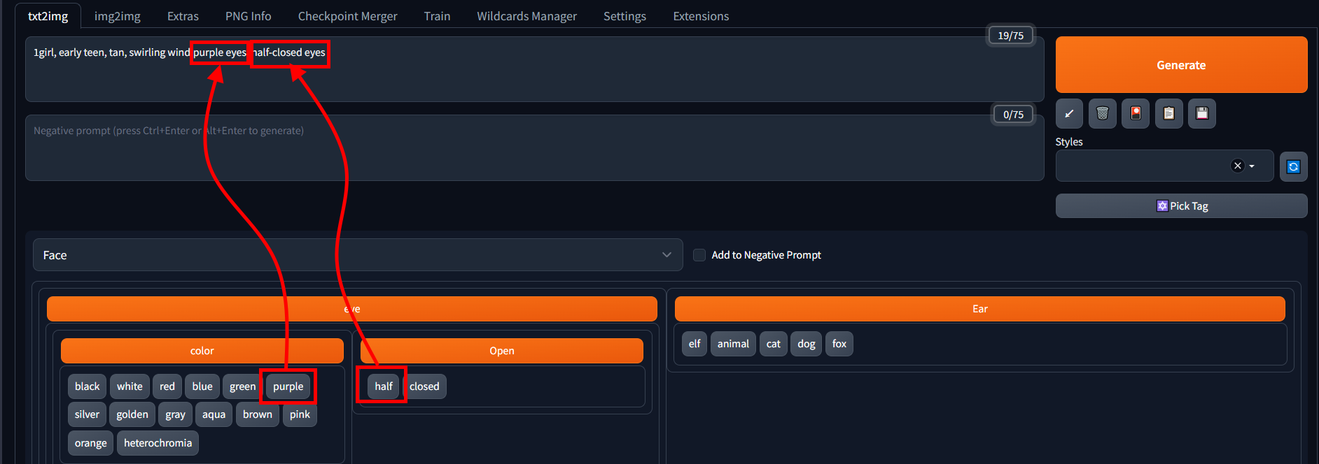설치가 끝나면 위 그림과 같이 txt2image 탭에 새로운 버튼이 하나 생겨납니다. 이것을 눌러 프롬프트 입력 모드로 진입 할 수 있습니다. 이지 프롬프트는 txt2image의 프롬프트 칸에만 입력이 됩니다.