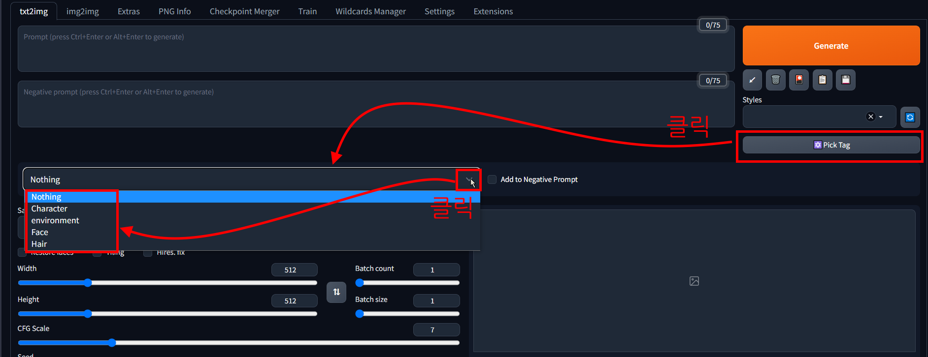 프롬프트를 입력한 예입니다. 참고로 네거티브 프롬프트를 추가하려면 Add to Negative Prompt란에 체크를 해주면 됩니다.
