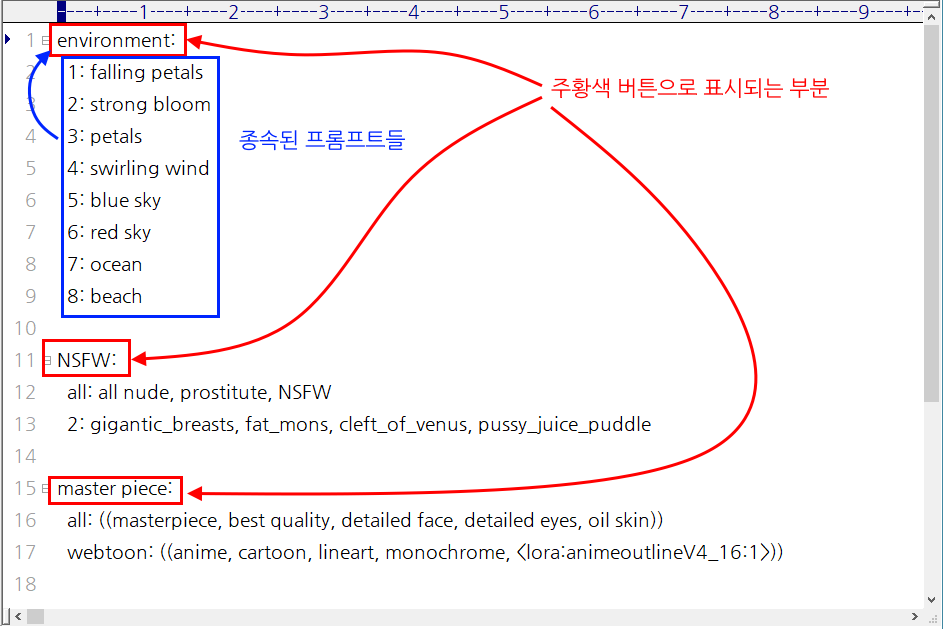 구조를 보면 기본 구조는 (버튼명: 프롬프트) 이 구조로 되어 있습니다. 버튼명: 엔터 아랫줄부터는 그 버튼명에 종속되는 프롬프트들이 배치가 됩니다. 직접 구성한 이지 프롬프트 배치 파일을 보시죠.