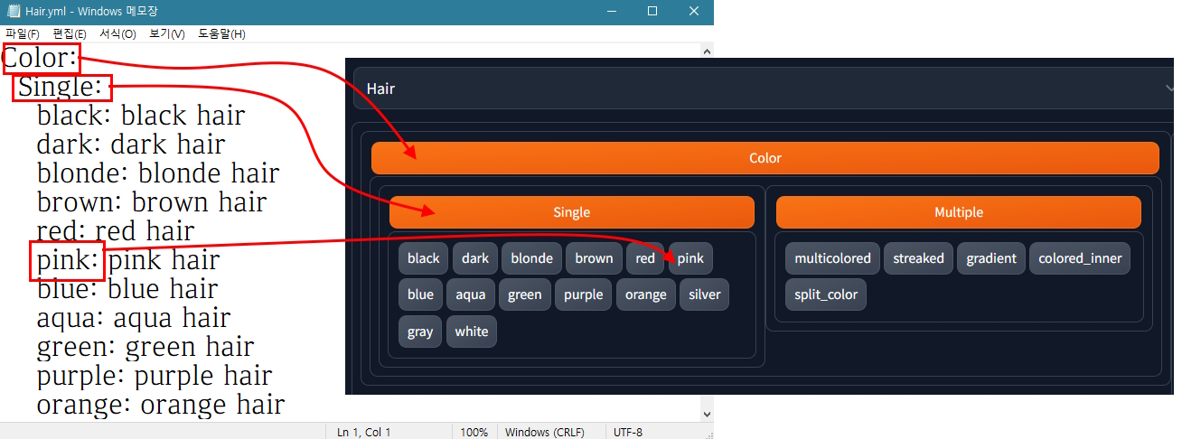 위 구조에서 볼 수 있듯이 버튼 이름은 자유롭게 정의 할 수 있으며, 프롬프트 역시 단일 프롬프트가 아닌 멀티 프롬프트가 가능하며 각종부호와 강도수치까지 모두 입력이 가능 합니다. 다만, 한글입력은 불가 합니다. (인식을 하지 못합니다. 혹여 버튼명에 한글을 생각 하신다면 그 생각 버리시고 브라우저 자동번역에 의존 하시기 바랍니다)